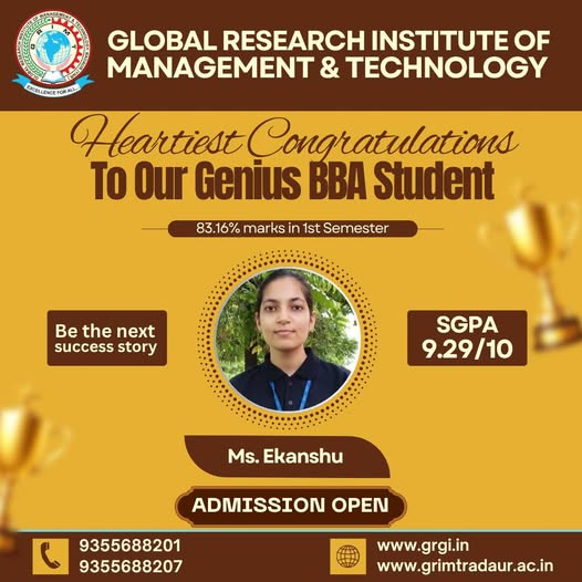 Congratulations to Ekanshu (BBA 1st Semester) for securing an outstanding SGPA of 9.29/10 with 83.16% marks (499/600)