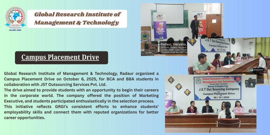 Global Research Institute of Management & Technology, Radaur, successfully organized a Campus Placement Drive in collaboration with JST Outsourcing Services